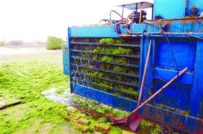 现场作业区负责人介绍,现场的铲车把运来的新鲜浒苔倾倒至浒苔压榨机,在液压机的挤压下,浒苔中海水被分离出来,再用铁丝进行打包,只需5分钟左右,刚才还绵软一团的浒苔就形成了一个浒苔包。“鲜浒苔与压榨后的浒苔的重量比例约为3.5:1,每个浒苔块重约3吨,掺杂沙子较多的浒苔会重些,达到3.5吨。一辆卡车一次能运8-10个浒苔包,就相当于运送了100吨鲜浒苔,这大大提高了浒苔无害化利用的效率。”修志浩说。除了陆域的浒苔被送往各个集中处理点压榨脱水外,海上打捞上来的浒苔也将经过压榨脱水,送往胶州进行无害化处理和资源化利用。