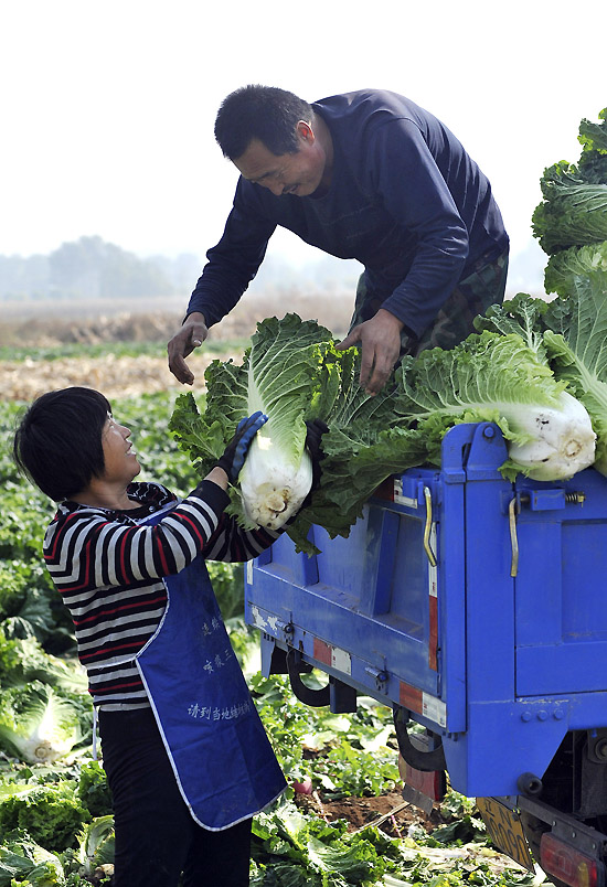 10月9日,在辽宁省朝阳市双塔区桃花吐镇的田野里,农户在收白菜。