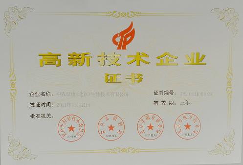 该证书的获得是基于政府相关部门对中农绿康从事高新技术领域研发工作的肯定与认可,同时也为中农绿康进一步的工作带来了巨大的推动力。