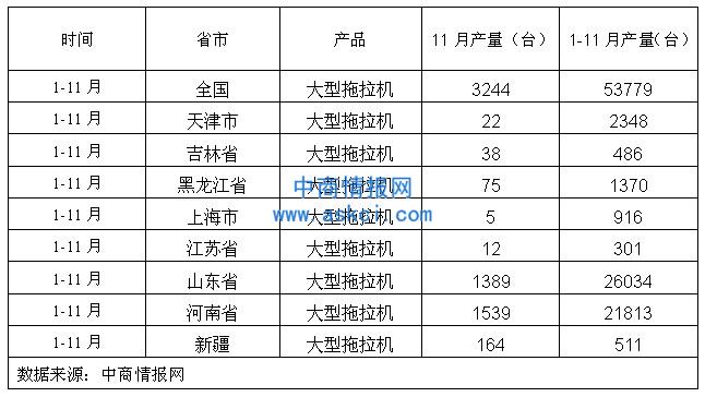 2012年1-11月中国大型拖拉机分省市产量数据统计