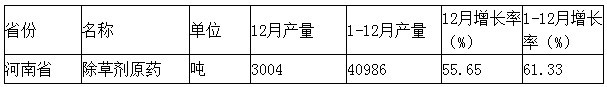 中商情报网数据显示:2012年1-12月河南省除草剂原药产量为40986吨。