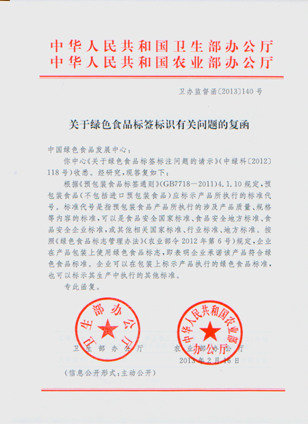 你中心《关于绿色食品标签标注问题的请示》(中绿科[2012]118号)收悉。经研究,现答复如下: