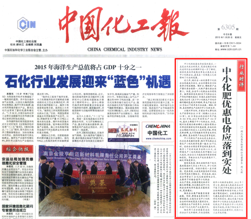 图为2013年1月25日,《中国化工报》头版刊发周义新名为《中小化肥优惠电价应落到实处》的文章