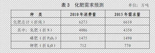 我国化肥消费90%用于农业,10%用于工业。2010 年我国化肥表观消费量为6273 万吨,其中农用化肥氮、磷、钾施用比例为1∶0.36∶0.18。根据“十二五”期间农业生产的品质要求和多样化发展等因素预测,2015 年农用化肥氮、磷、钾施用比例按1∶0.38∶0.25 考虑,兼顾工业需求,预计2015 年我国化肥需求总量及结构见表3。
