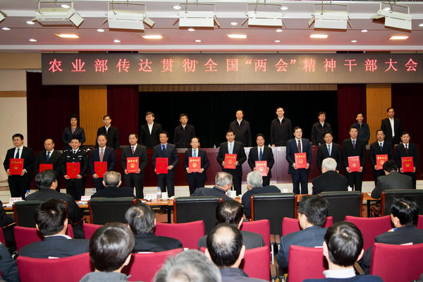 农业部副部长张桃林传达“两会”精神,副部长牛盾宣读了《农业部关于表彰2012年度绩效管理优秀司局单位的决定》。在机关的部领导,离退休老部长,农业部人大代表、政协委员,部机关副处以上干部等参加了会议。