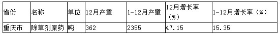 中商情报网数据显示:2012年1-12月重庆市除草剂原药产量为2355吨。