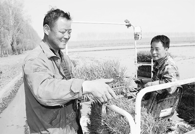 为今春水稻插秧提速度保质量,黑龙江垦区绥滨农场新购88台插秧机。图为农场第三十居民组农户在搬运秧苗插秧。