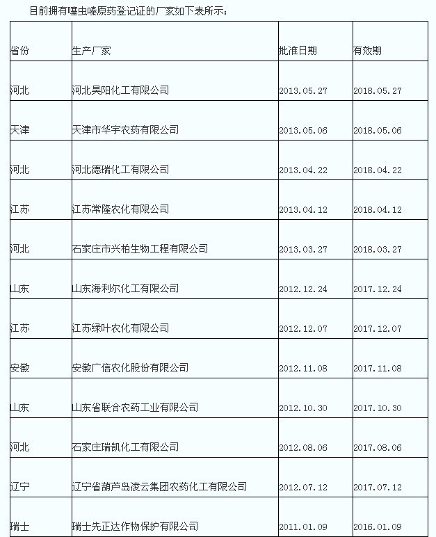 噻虫嗪是目前全球销售额最大的杀虫剂品种,2011年销售额超过10亿美元。随着先正达噻虫嗪专利到期日(2013年7月21日)的逐渐临近,国内企业纷纷抢占市场先机,2013年刚刚过去5个月,已经又有5家企业获得了噻虫嗪原药登记。