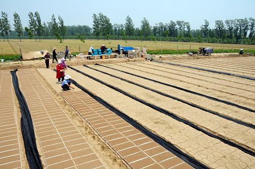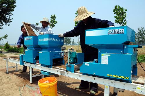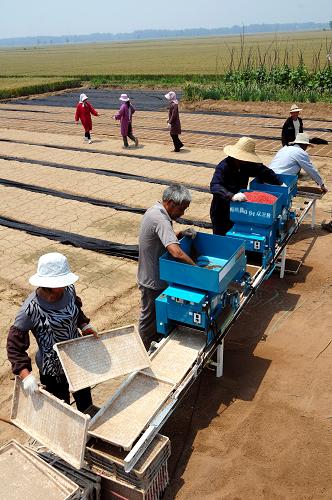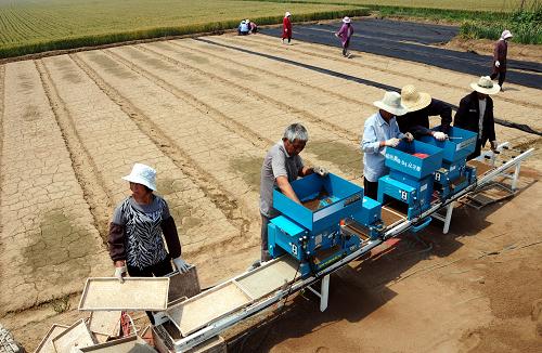6月4日,山东省临沂市郯城县马头镇农民在使用“水稻流水线育秧机”。新华社发(房德华 摄)