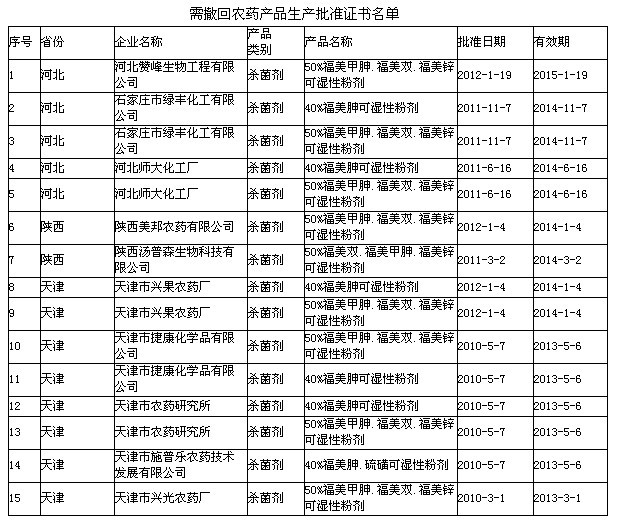 工信部原材料司2013年6月5日发布工信原函〔2013〕212号公告,决定对已颁发的福美胂、福美甲胂及所有胂制剂等15个农药产品生产批准证书予以注销。