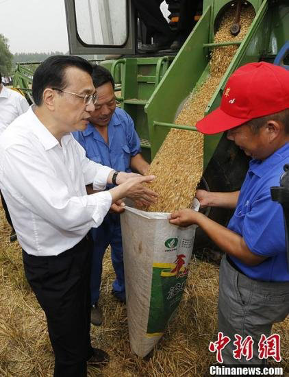 中国国务院总理李克强7日在河北邯郸考察三夏麦收情况。李克强说,小麦是夏粮的主要品种、是填饱肚子的口粮,小麦增收不仅会使农民增收,也会使天下安心。