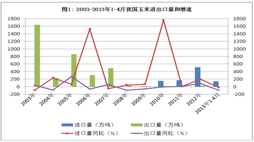 图1:2003-2013年1-4月 我国玉米进出口量和增速