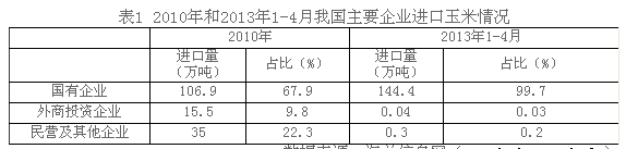 2013年1-4月,我国国有企业进口玉米144.4万吨,减少27.0%,占同期我国玉米进口总量的99.7%,比2010年提升31。8个百分点。同期,私营企业进口0.3万吨。(见表1)