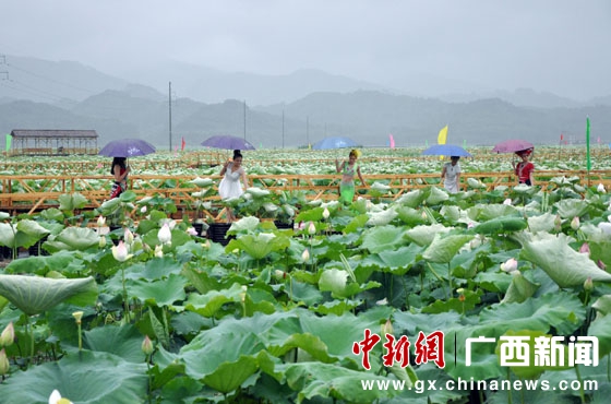 7月2日,游客在位于广西南宁市宾阳县黎塘镇的万亩荷花基地赏荷。由广西昊润投资有限公司投资建设的黎塘荷香人间现代农业示范基地规划总面积1万亩,以“公司+基地+农户”的模式,采用国内领先的莲藕套种晚稻栽培技术,实现规模化、标准化生产,有效带动当地农户致富。该基地四季风光景色不同,吸引大批游客前来休闲旅游观光。目前,该基地年产莲藕1.25万吨,稻谷150万公斤,实现农业总产值3600万元人民币,产品远销海内外。