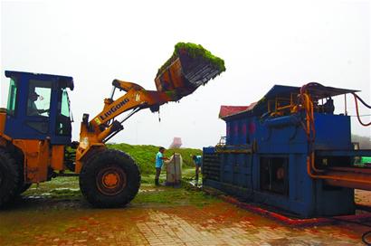 现场作业区负责人介绍,现场的铲车把运来的新鲜浒苔倾倒至浒苔压榨机,在液压机的挤压下,浒苔中海水被分离出来,再用铁丝进行打包,只需5分钟左右,刚才还绵软一团的浒苔就形成了一个浒苔包。“鲜浒苔与压榨后的浒苔的重量比例约为3.5:1,每个浒苔块重约3吨,掺杂沙子较多的浒苔会重些,达到3.5吨。一辆卡车一次能运8-10个浒苔包,就相当于运送了100吨鲜浒苔,这大大提高了浒苔无害化利用的效率。”修志浩说。除了陆域的浒苔被送往各个集中处理点压榨脱水外,海上打捞上来的浒苔也将经过压榨脱水,送往胶州进行无害化处理和资源化利用。