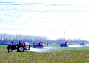 高效植保技术成为近年来植保发展的新方向。图为北京市专业化统防统治人员操作农机进行有害生物防控。