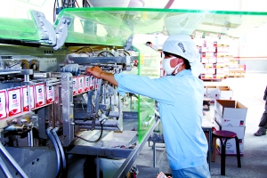 低碳环保、绿色发展逐渐成为未来农药行业发展趋势。图为甘肃华实农业科技有限公司工作人员正在操作甲霜灵悬浮剂灌装设备。