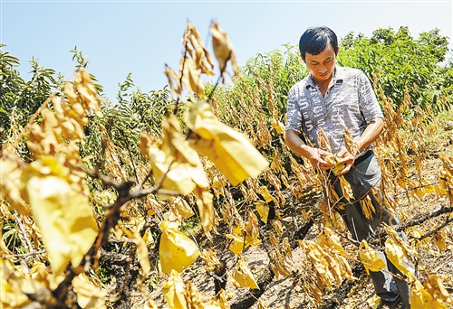 8月7日,奉化市水蜜桃种植大户杨金宝查看因近期持续高温晴热而枯死的桃树。