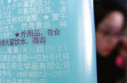 昨日,市民黄女士在超市买了一瓶六神驱蚊花露水。当她仔细阅读说明时发现,这瓶花露水的外包装上竟然写有“农药正式登记证号”、“农药生产批准文件号”,在瓶身有红色字体提醒:“外用品,勿食用,如不慎服用请大量饮水,微毒。”“这岂不是往身上喷农药?”黄女士很担心这种添加了农药成分的驱蚊水使用是否安全,尤其是给家中2岁大的儿子使用,会不会中毒?