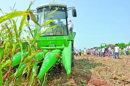 8月16日,在宜阳县玉米收获机演示会现场,先进的玉米收获机吸引了种粮农民前来观摩。今年,该县玉米种植面积达40万亩,为推进农业机械化,县农机部门组织多种新型玉米收获机开到田间,为群众现场展示。⑤3田义伟 摄