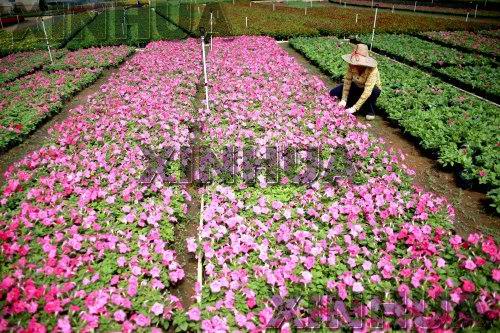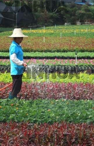 9月15日,广西桂林市叠彩区大河乡的花农正在管护花卉。