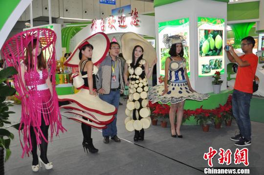 河北大名草编是国家非物质文化遗产项目,图为本届农交会上美女展示草编时装秀。