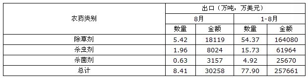 8月份,除草剂出口量保持领先,达到5.42万吨,同比增长31.4%,出口金额同样保持大幅增长,增幅为64.1%,达到1.81亿美元;杀虫剂出口量为1.96万吨,同比增长22.8%;杀菌剂出口0.63万吨,同比增长7.0%。