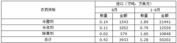 8月份,进口数量最大的是杀菌剂,为0.14万吨,同比下降28.4%;杀虫剂进口量0.11万吨,进口额0.10亿美元;除草剂进口量0.02万吨,同比下降86.9%。