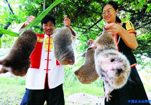 恭城镇飞鼠岩屯竹鼠养殖户黄见专夫妻展示他们养的竹鼠。