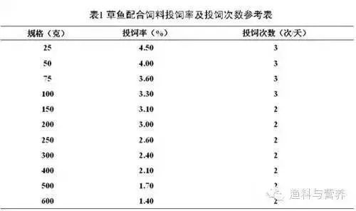 投饲率是指根据草鱼的存塘总重量而确定的投饲百分率,投饲率常常受鱼体规格及水温的影响,规格较小的鱼其投饲率大于规格较大的鱼。水温过高或过低都会使草鱼的摄食量下降甚至停止摄食。使用浮性颗粒饲料时,很容易观察到投饲饱食点,因此特别推荐投喂浮性颗粒饲料;而使用沉性饲料时,就很难确定其饱食点,因此,投喂沉性颗粒饲料时,投饲率的调整应根据定期取样测定鱼的平均体重,计算出鱼的总重,根据鱼体规格确定投饲率,详见表1。