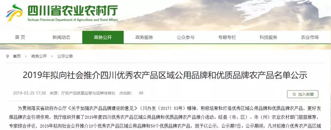 经县(市、区)、市(州)农业农村部门层层推荐,专家综合评议,2019年四川拟向社会公开推介北川茶叶、雅鱼等10个优秀农产品区域公用品牌和50个优质品牌农产品,现予以公示,公示截止时间为3月31日。
