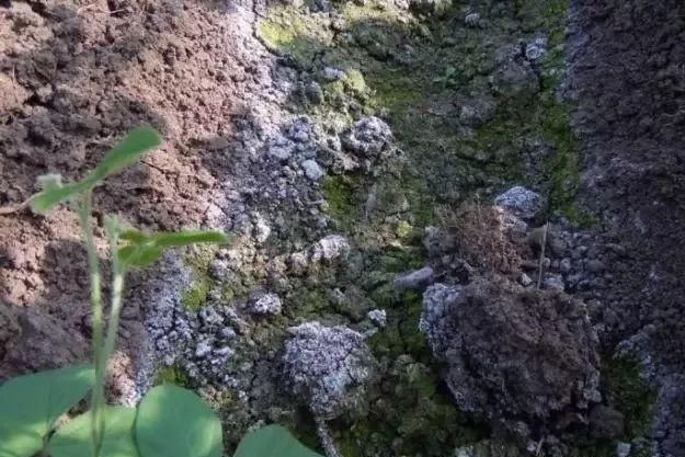 土壤盐害有轻重之分。①初期的土壤,比如种菜一年左右,会出现绿油油的一层绿苔,也就是“青霜”,发青是土壤盐渍化最初的表现。②土壤盐渍化中度表现在:地面湿度大的时候会看到一块块红色的胶状物,等到土壤干了之后,就会出现一片片类似红砖面儿一样的东西,即“红霜”,这个时候就会造成叶片萎蔫等负面影响,影响产量。③土壤盐渍化更严重的表现是:地面在干燥的情况下会出现薄薄的一层“白霜”,此时盐渍化已特别严重,棚室内蔬菜根系会特别少,后期植株连片萎蔫、生长受阻,出现严重早衰,根系的水分倒流,根系皮层会发红,茎出现萎蔫、腐烂。