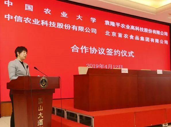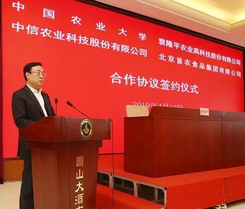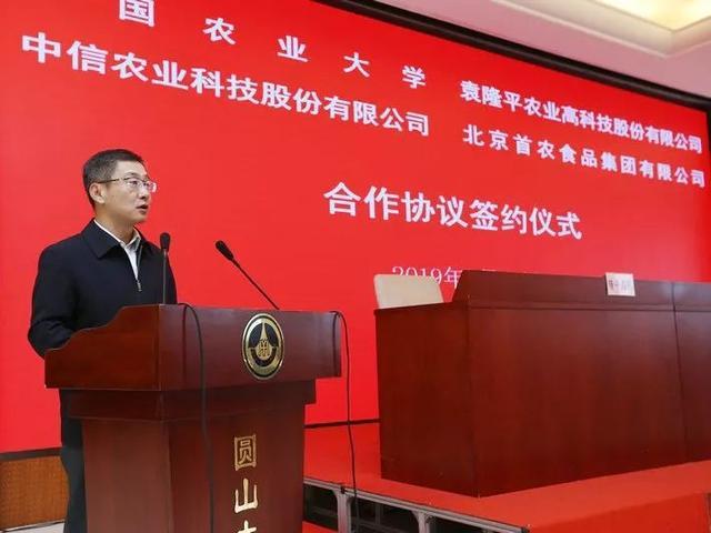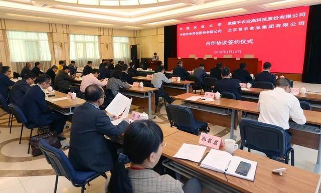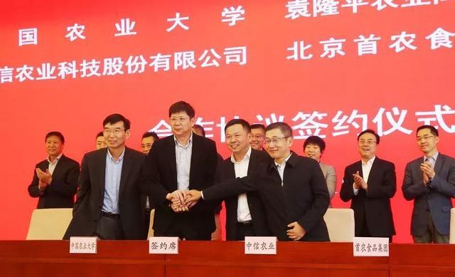 4月12日,首农食品集团、中国农业大学、隆平高科和中信农业签署战略合作协议。北京市国资委党委副书记、副主任晋秋红出席签约仪式并致贺辞。首农食品集团党委书记、董事长王国丰,党委副书记、副董事长、总经理薛刚,副总经理常毅,以及中国农业大学、隆平高科、中信农业的领导和相关部门负责人等出席签约仪式。首农食品集团董事尹彦勋主持签约仪式。