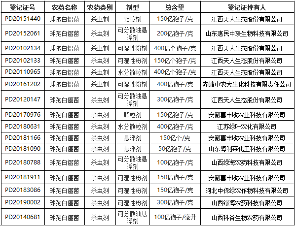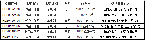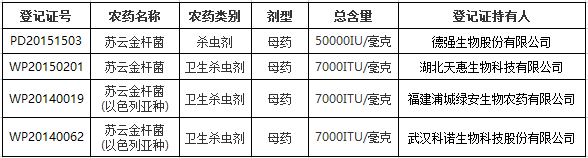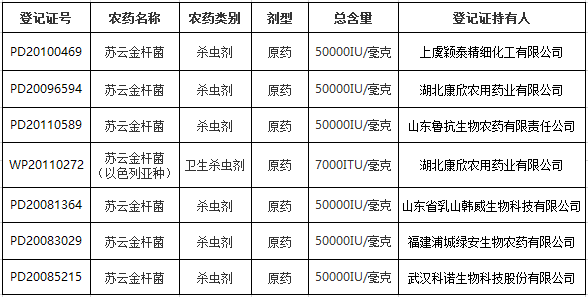 随着,剧毒、高毒农药的禁限用,绿色、低毒、对非靶标生物安全性高的生物农药品种备受广大农药企业以及整个农药行业的关注!目前,苏云金杆菌、球孢白僵菌、天然植物生长调节剂、植物源农药、棉铃虫核型多角体病毒等病毒性农药、细菌、真菌等生物农药品种备受农药市场青睐。今天重点介绍一下苏云金杆菌、球孢白僵菌在国内的登记情况。