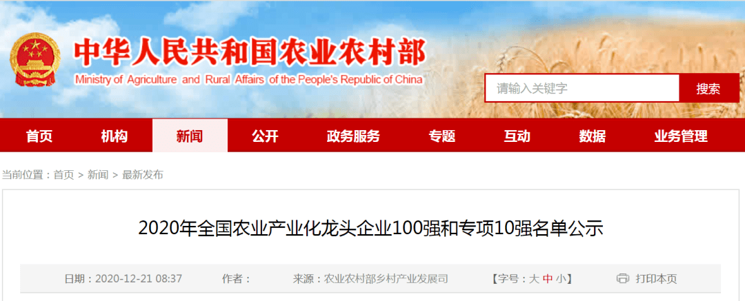 附件:2020年全国农业产业化龙头企业100强和专项10强名单