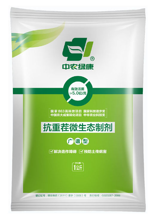 抗重茬菌剂是中农绿康(北京)生物技术有限公司利用中国农业大学国际领先的防病抗重茬科技成果,选用防病促生芽孢杆菌、木霉菌、放线菌、粘帚霉等高效菌株,采用现代微生物发酵技术加工制备而成的农用微生物制剂。本产品主要通过菌株在作物根表、根际和体内定植、繁殖和转移,充分发挥菌株的促长、固氮、解磷、解钾、抗病、抗逆、改良土壤等功能,达到促进作物生长、提高肥料利用率,增强抗病等抗逆性和改善作物品质等功效。特别是克服作物生产中连作带来的障碍,预防和解决作物重茬危害,是修复土壤和生产无公害、绿色、有机食品的首选产品。